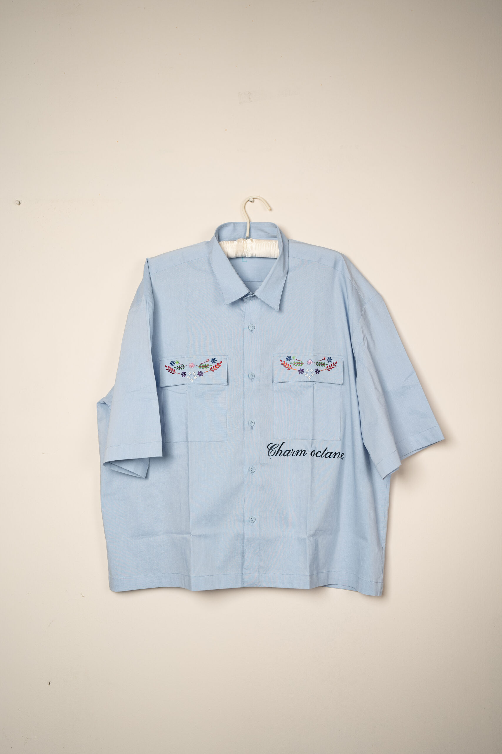 It features a striking, hand-embroidered portrait—a testament to mind-blowing artistry—complemented by intricate run-stitching along the sleeves, pocket, and hem. Designed with a modern oversized fit and a relaxed drop shoulder, it marries heritage textile work with a bold, contemporary silhouette.