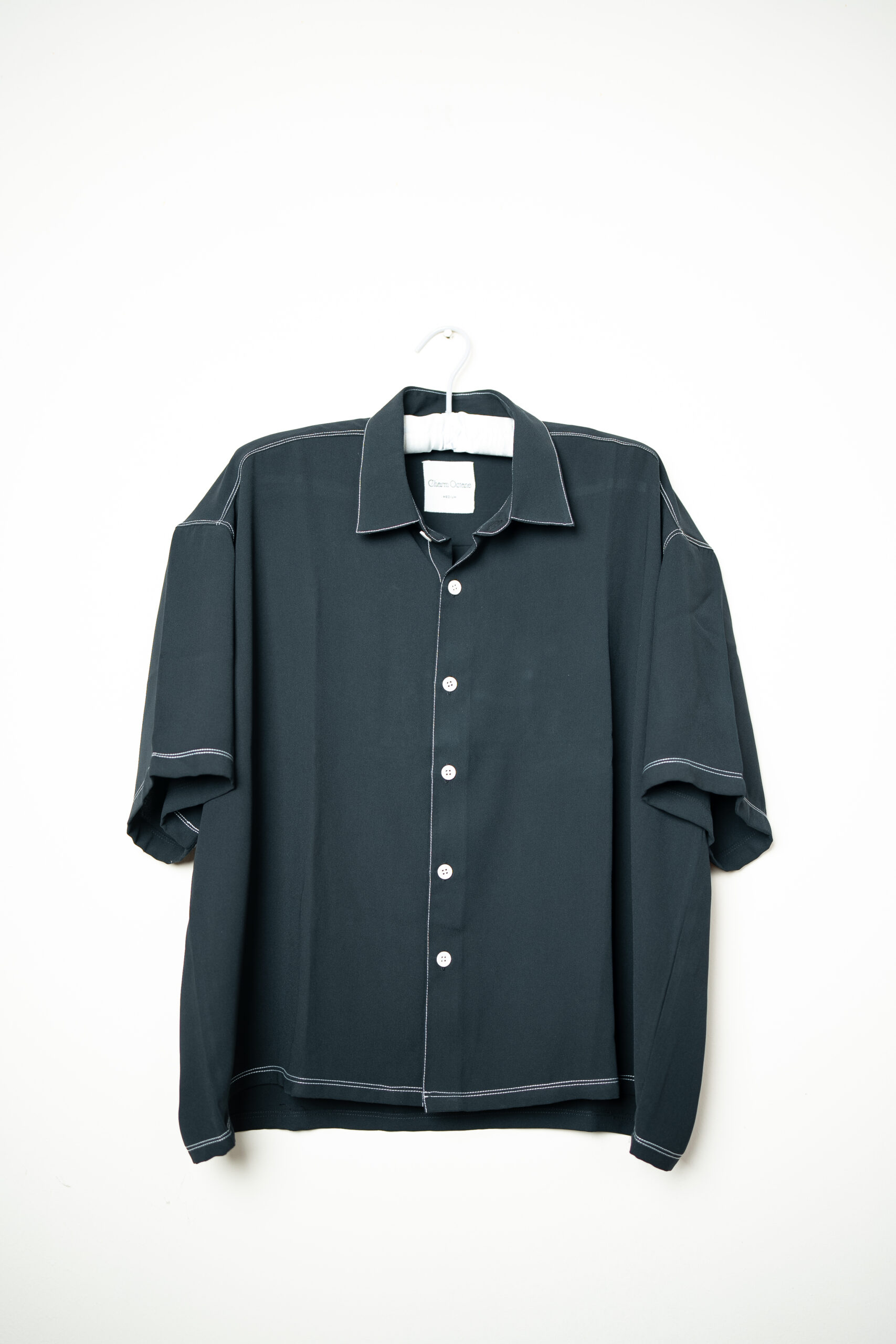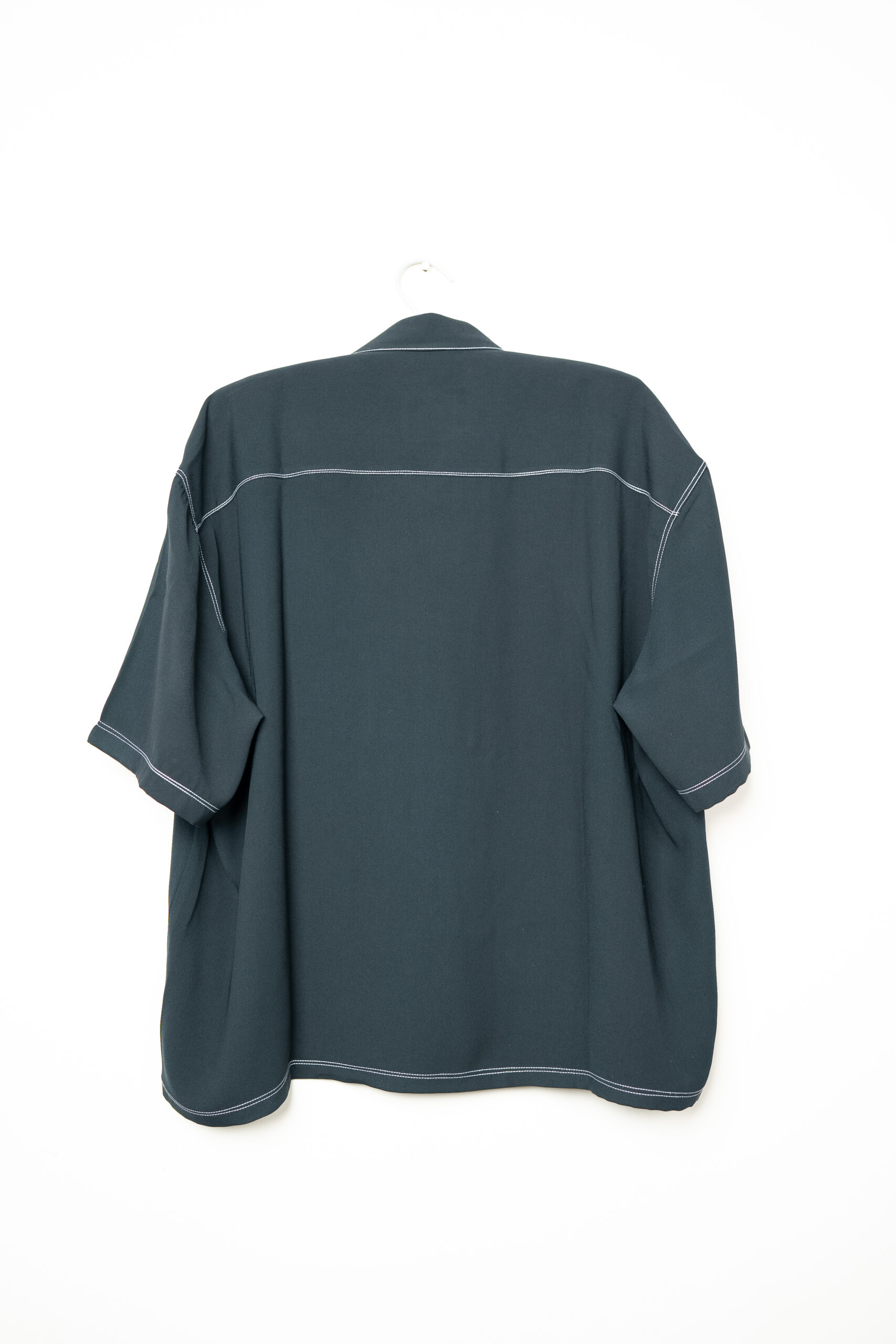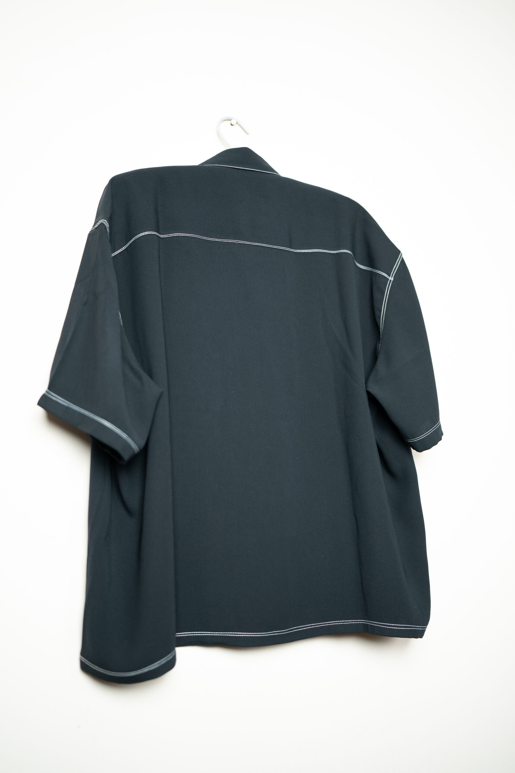 This is a short-sleeved, button-down shirt featuring a distinct retro-utilitarian aesthetic. The overall look blends mid-century bowling shirt influences with contemporary streetwear minimalism.