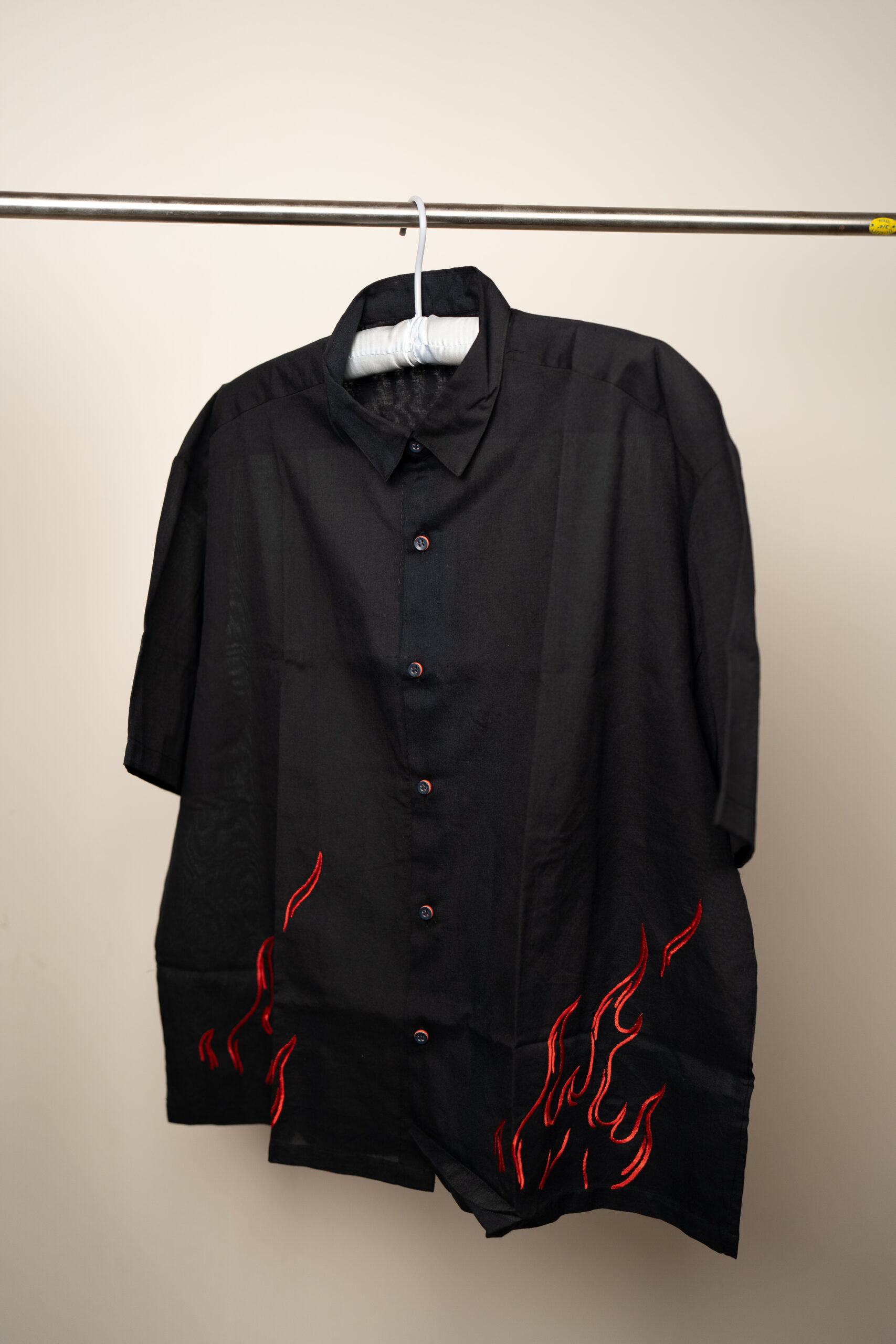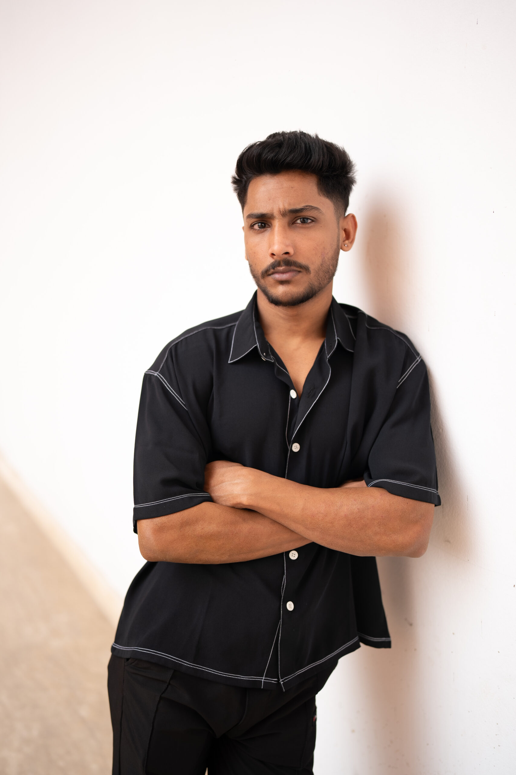 The fit: It has a boxy, oversized fit and is presented in a black with toned up with white stitching.